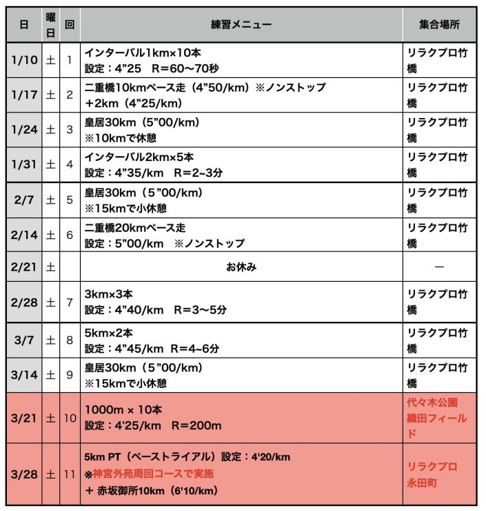 1〜3月の毎週土曜日開催のマラソン3時間30分切りを目指す方向けの練習会です。