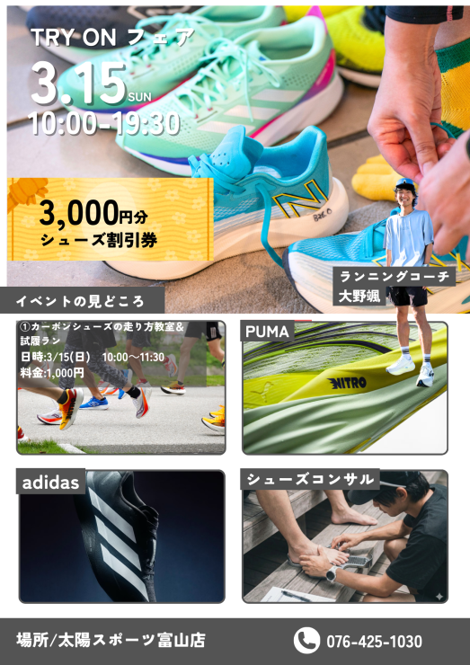 そんなランナーの悩みを解決するため、太陽スポーツとプロランニングコーチ・大野颯がタッグを組んだスペシャルイベント「シューズ トライオンWEEKS」を開催します!