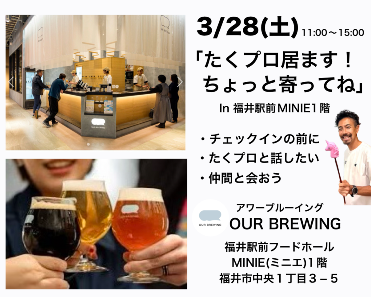 ふくい桜マラソンの前日と当日、福井駅前のアワーブルーイングさんとのイベントのご案内です